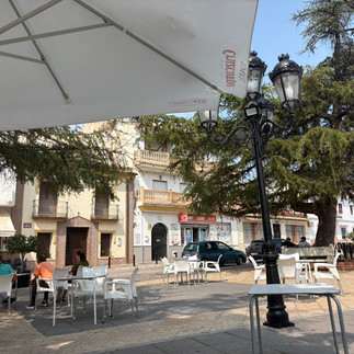 A quick look for vultures proved fruitless but we continued our stroll up into the town. We were on the hunt for a bar or cafƩ to sit outside of, like the locals do. We reached the bustling (empty) town centre, stopping off at another viewpoint before heading down a hill where we found a bit more life. We knew we were successful when we came across a large tree-shaded area with tables looking out over the valley. We almost didn't have to discuss it, just looking at each other and nodding "this is it, lads".